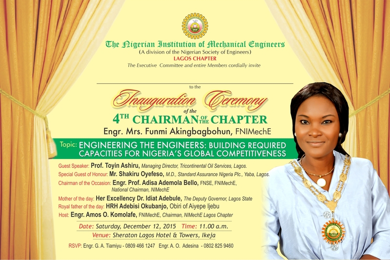 HomeEngineers Invitation to Inauguration of Engr Funmi Akingbagbohun as NIMechE Lagos Chairperson byAdmin -December 09, 2015 0 Dear Engineer, You are cordially invited. Thanks and best regards Engr Femi John Adedotun General Secretary Tags Engineers Event NIMechE Facebook Twitter